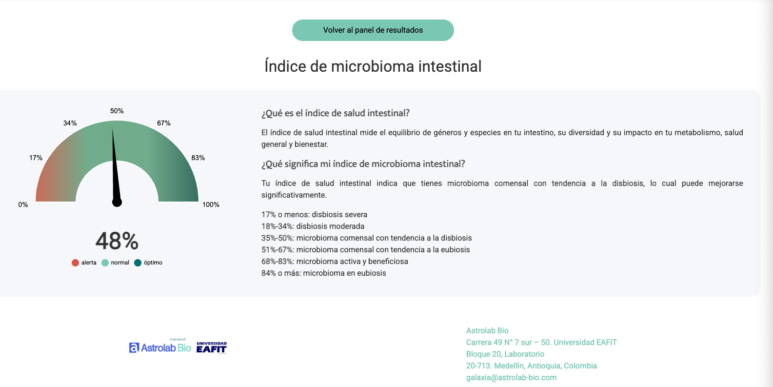 El índice global representa una medida integradora del estado general del microbioma intestinal, considerando tanto la composición bacteriana, como su diversidad y funcionalidad metabólica.