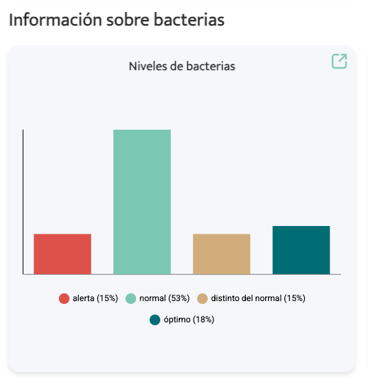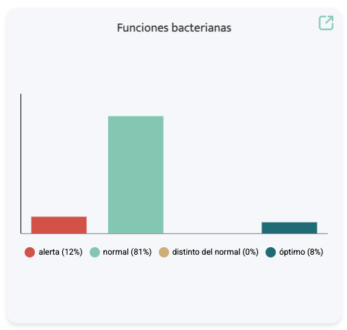 Este parámetro muestra la distribución porcentual de las bacterias según su estado: óptimo, normal, alerta o distinto del normal. En el informe ejemplo, el 53% de las bacterias se encuentran en rango normal, el 18% en óptimo, y el 15% en alerta, con otro 15% fuera del rango de referencia. Esto significa que la mayoría de los grupos microbianos mantienen un comportamiento fisiológico, pero existe una fracción significativa con desequilibrio ecológico, posiblemente asociada a hábitos dietarios monótonos, baja ingesta de fibra o estrés oxidativo intestinal.