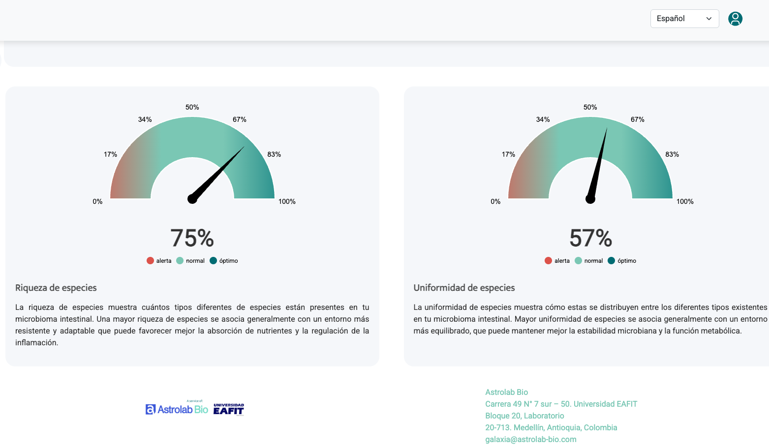 La riqueza (75%) representa el número total de especies detectadas. Una alta riqueza es sinónimo de ecosistema versátil, con múltiples rutas metabólicas activas y mayor resiliencia ante cambios dietarios o ambientales. Este valor elevado es un factor protector frente a la obesidad y la inflamación crónica.
