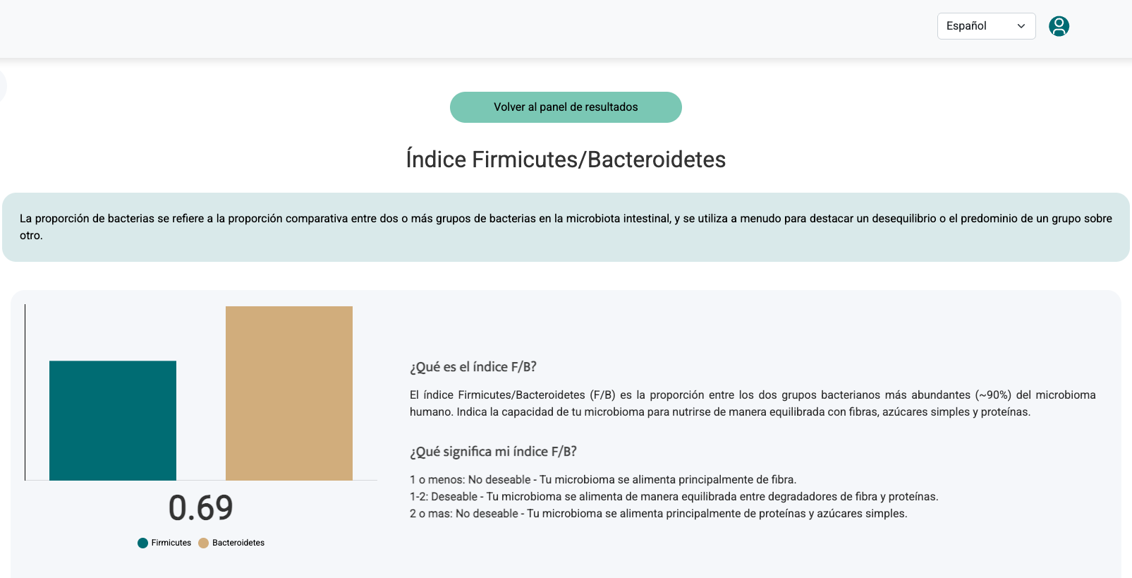En este ejemplo, el ratio es 0.69, lo cual indica un predominio de Bacteroidetes, grupo especializado en degradar polisacáridos complejos y producir propionato, un metabolito que reduce la lipogénesis y mejora la homeostasis glucémica. Este valor es considerado óptimo, pues favorece el metabolismo de la fibra sobre el de los azúcares simples.