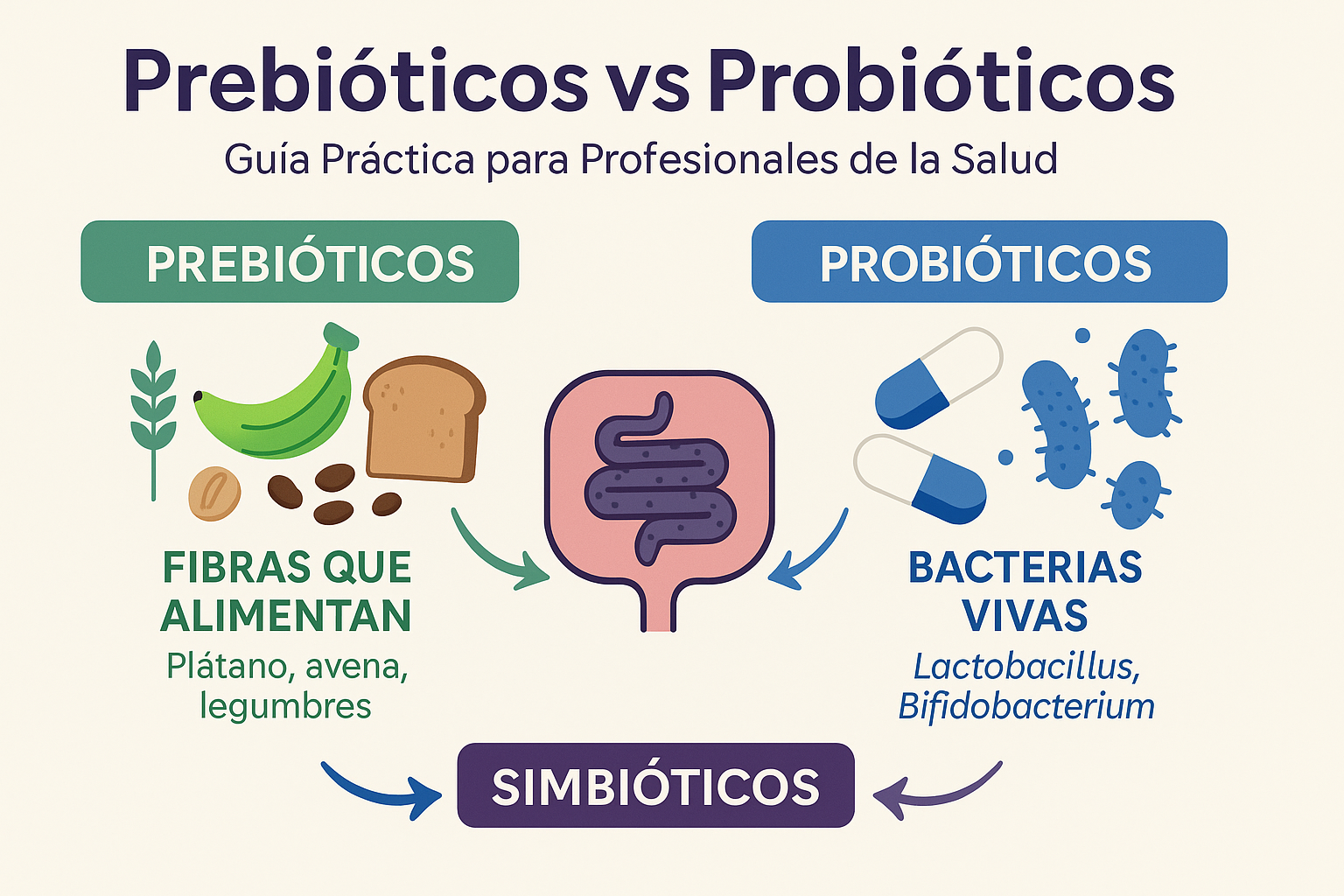 Recuerda: los prebióticos alimentan lo que ya tienes, los probióticos agregan lo que necesitas. Esta simple frase puede ayudarte a tomar mejores decisiones clínicas y a explicar claramente las opciones a tus pacientes.